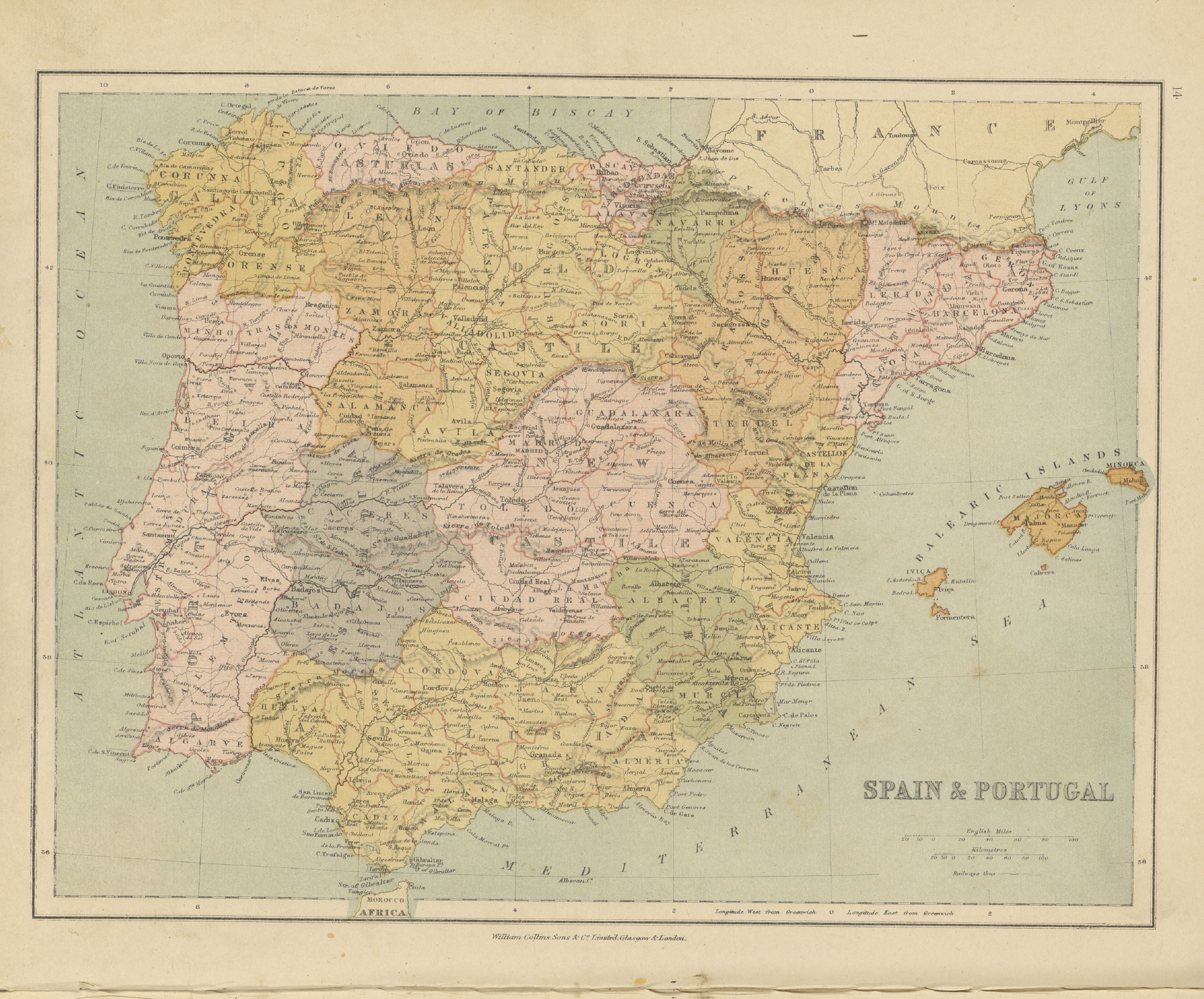 NOTAS Divisiones administrativas en color. – Marco graduado, meridianos y paralelos formando cuadrícula. –Relieve por sombreado. – Abundante toponimia en inglés. – Red de caminos e hidrografía con la red principal. – Longitud desde el Meridiano de Greenwich. – Escala expresas en millas inglesas y en kilómetros. – En: `The Advanced Atlas / William Collins, Sons & Co. Ltd.. [1900-1913] |
