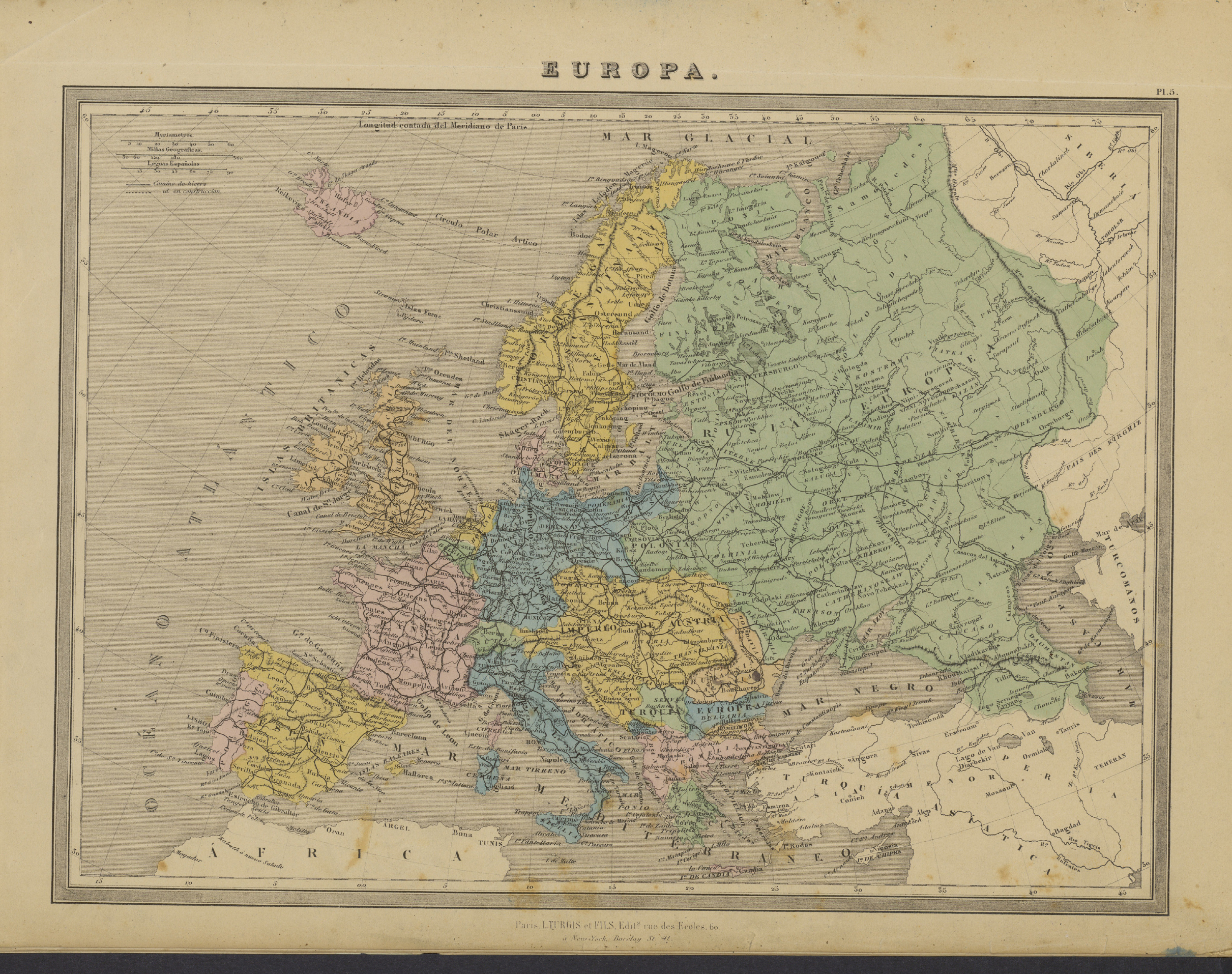 NOTAS Divisiones administrativas en color. – Marco graduado, meridianos y paralelos formando cuadrícula. –Relieve por sombreado. – Abundante toponimia en español. – Red de caminos con la red principal. – Longitud desde el Meridiano de París. – Costas sombreadas. – Escala expresas en miriámetros, millas geográficas y leguas españolas. – En margen superior derecho: `Pl. 5`. – En: `Atlas de Geografia / A. H. Dufour, revisto y aumentado por A. Voullemin, precedido de descripciones astronómicas redactadas de conformidad con las lecciones de Fr. Arago. 1833-1850` |