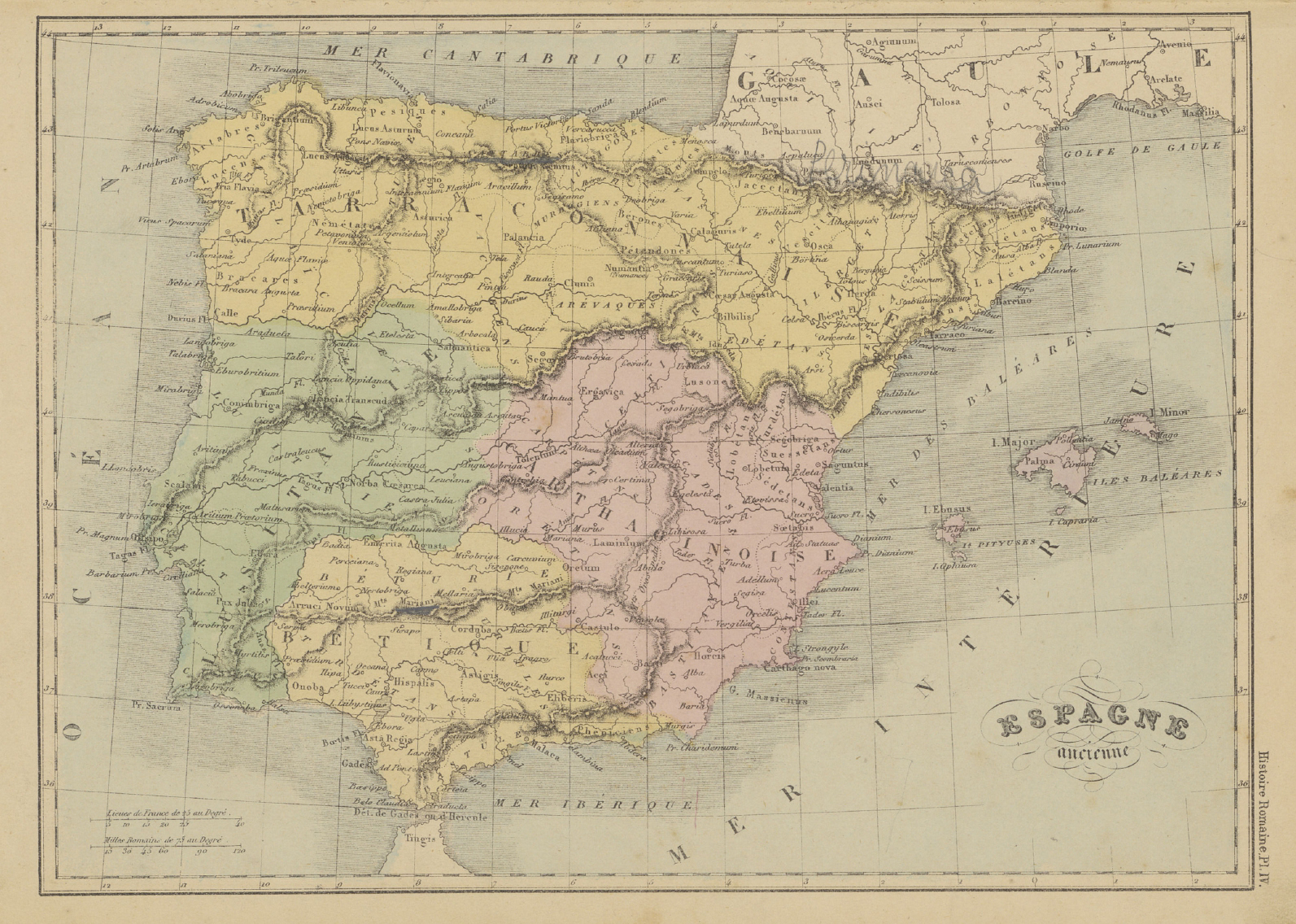 NOTAS Representación de España en la Edad Antigua. – Marco graduado, meridianos y paralelos formando cuadrícula. – Relieve por sombreado. – Abundante toponimia en latín. – Red hidrográfica. – Costas sombreadas. – Escala expresada en 40 leguas de Francia de 25 al grado y 120 millas romanas de 25 al grado. – En margen inferior derecho: `Histoire Romaine Pl. IV`. – En: `Atlas de Géograhpie Physique, Politique et Historique : a l`usage des écoles chrétiennes des frères par F. I. C. / Procure Générale des Frères. 1878` |