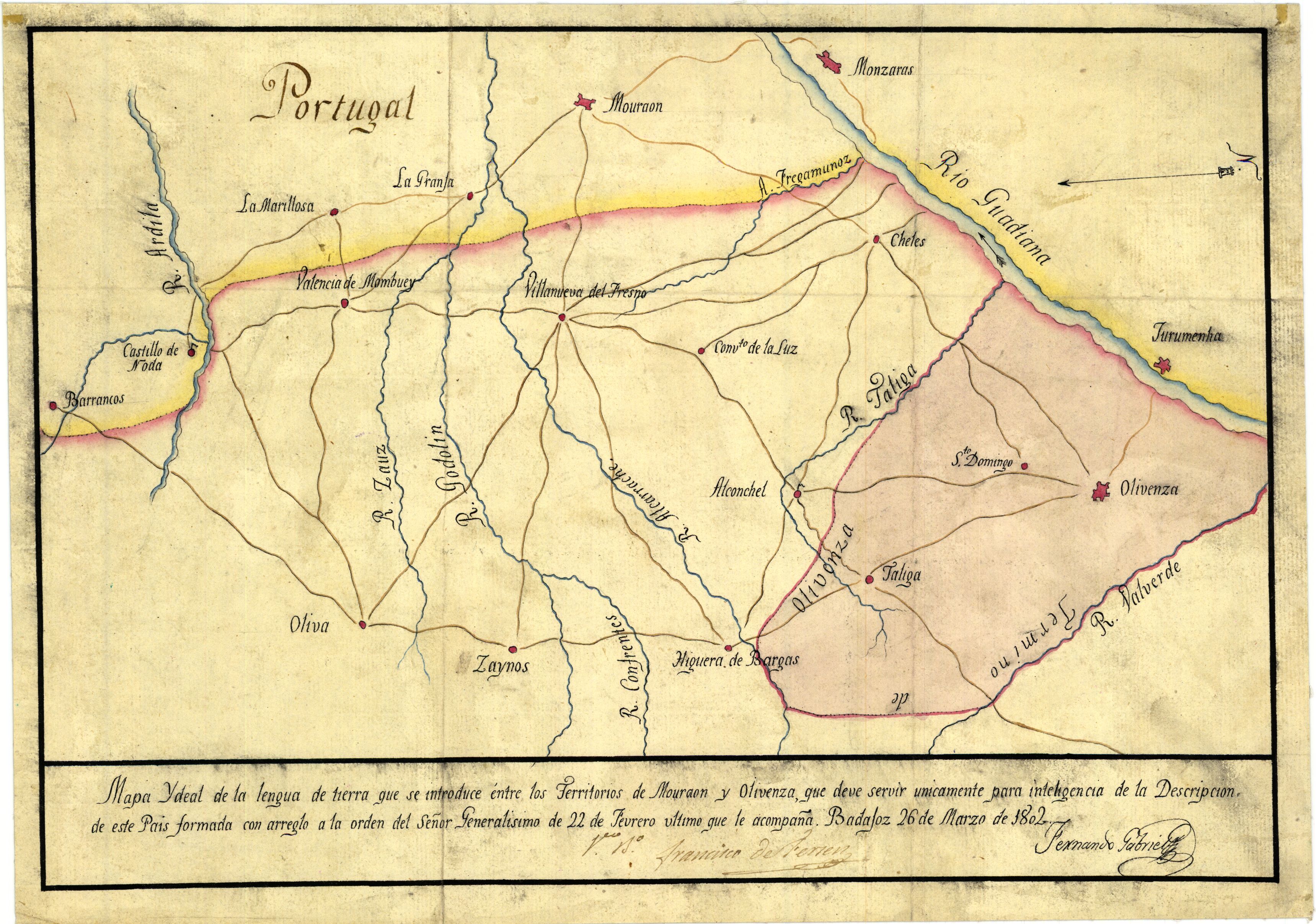 NOTAS Presenta la zona comprendida entre Olivenza, Oliva de la Frontera y Mourao. – 'Visto Bueno'. Francisco de Ferrer. – Orientado con flecha. – Manuscrito firmado, rubricado y fechado en Badajoz. A plumilla en tintas de varios colores y coloreado a la acuarela también en varios colores. – Manuscrito sobre papel de tina con corondeles y puntizones. – Indica caminos, curso del río Guadiana con flecha y núcleos de población de distinta categoría |
