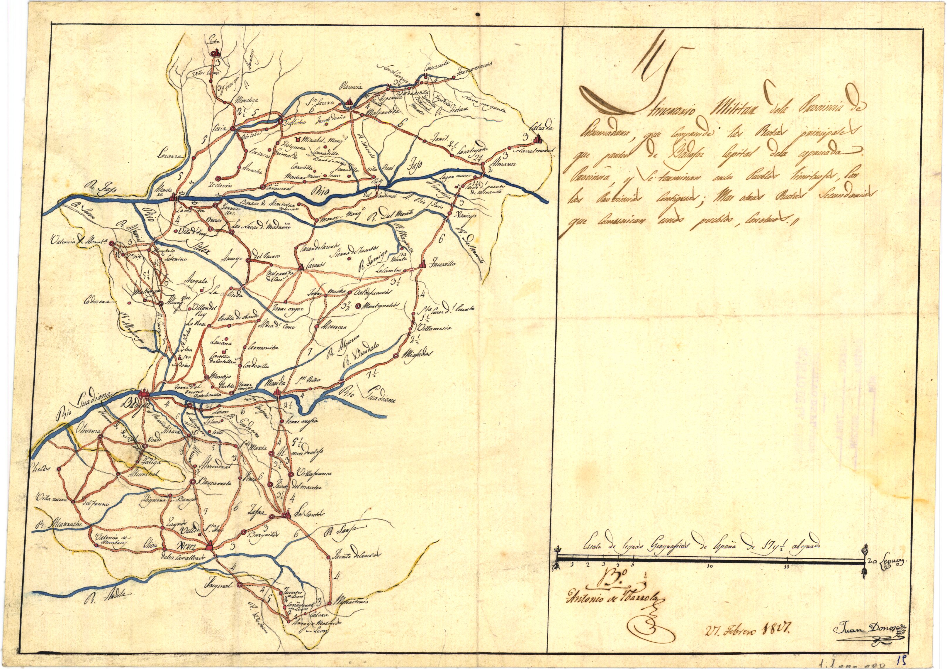 NOTAS Comprende la provincia de Badajoz y gran parte de la de Cáceres. – 'Visto Bueno': Antonio de Ybarroda. – Manuscrito firmado, rubricado y fechado. A plumilla en tinta negra y coloreado a la acuarela en varios colores. – Indica núcleos de población de distinta categoría y caminos con su distancia señalada en negro |