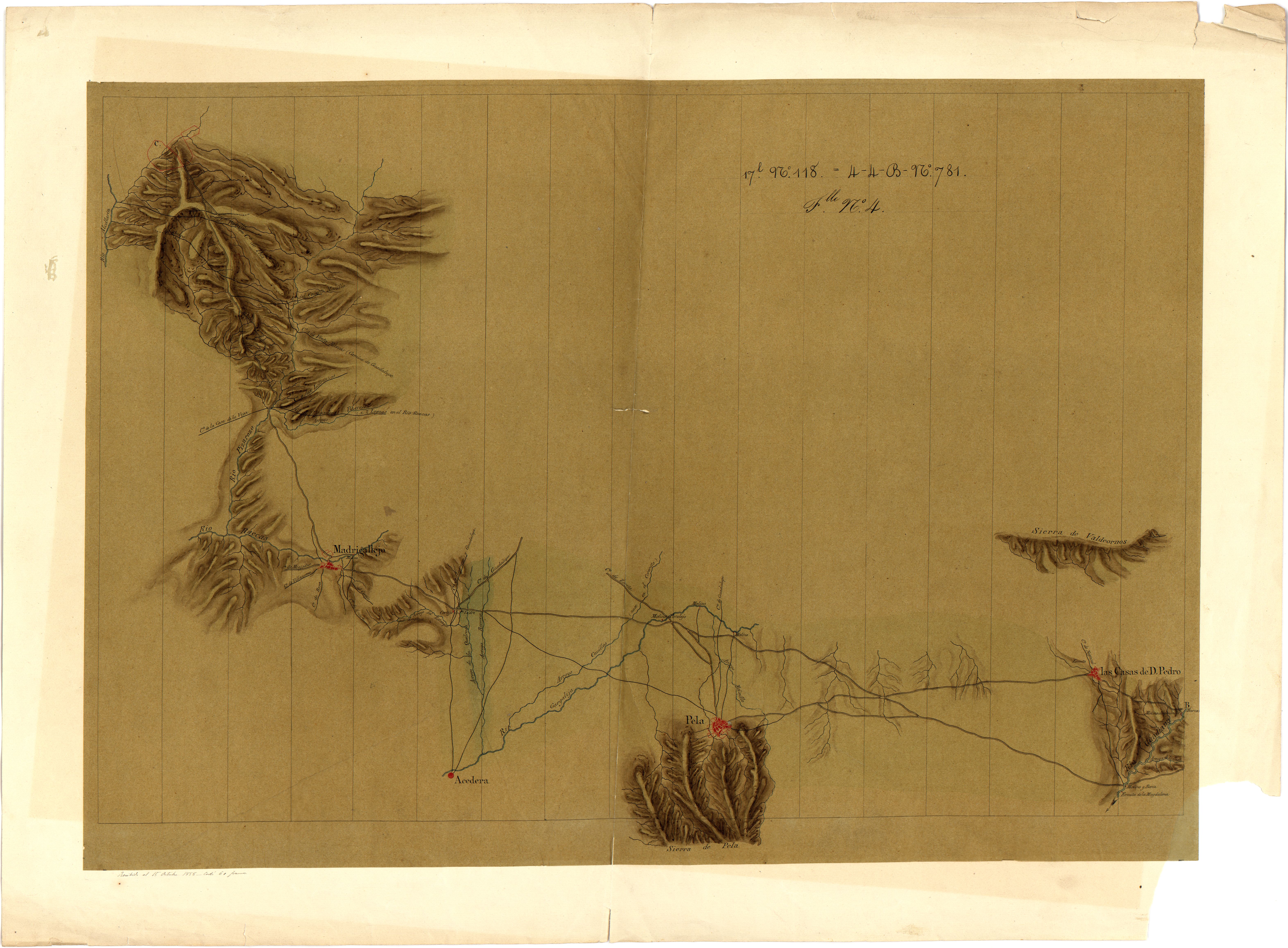 NOTAS Título propio tomado del Catálogo del Servicio Geográfico del Ejército: `Extremadura. Siglos XVIII a XIX`. 1972, p. 13. – Relieve representado por sombreado. – Manuscrito a plumilla en tinta negra y azul y coloreado la acuarela en varios colores. – Indica núcleos de población de distinta categoría y caminos. – En el margen superior derecho: `17l.N118=4-4-B-n781Fll.n4`, y en el inferior izquierdo: `Recibido el 15 Octubre 1858, costó 60 francos`. – Copia enviada por el Depósito de la Guerra Francés por gestión de D. Francisco Coello |