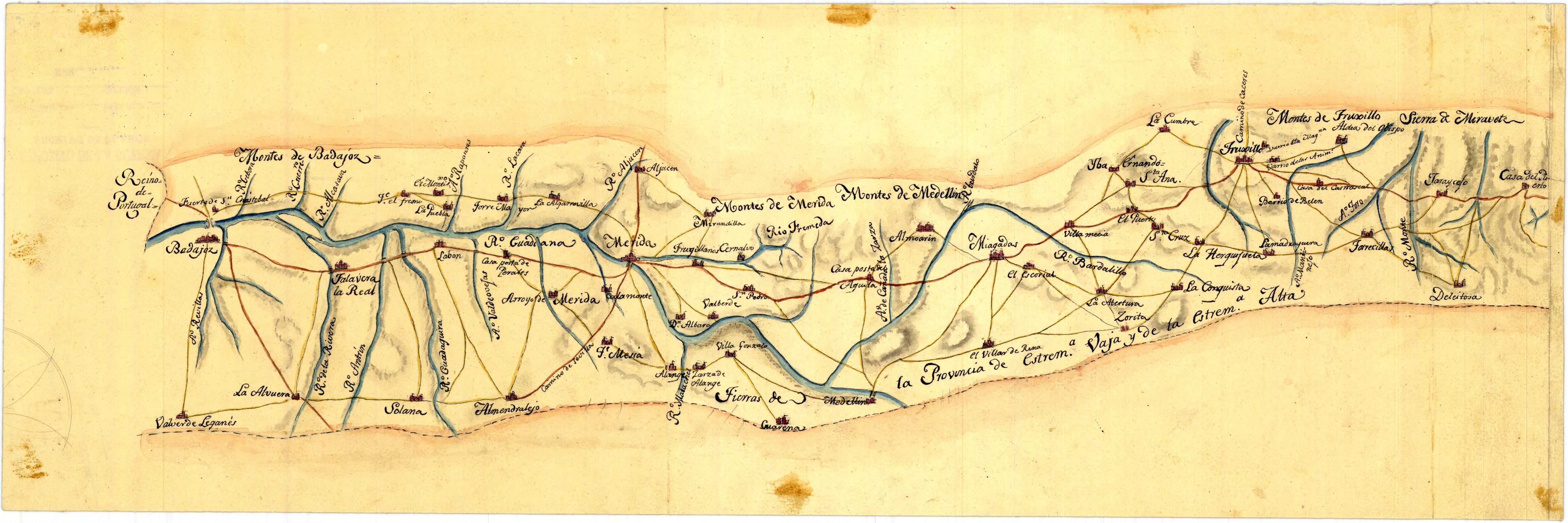 NOTAS Título propio tomado del catálogo del Servicio Geográfico del Ejército: 'Extremadura. Siglos XVIII a XIX'. 1972, p. 15. – Relieve representado por sombreado. – Manuscrito a plumilla en tinta negra y coloreado a la acuarela en varios colores. – Indica núcleos de población de distinta categoría y caminos. – En el margen izquierdo, anotaciones a lápiz |