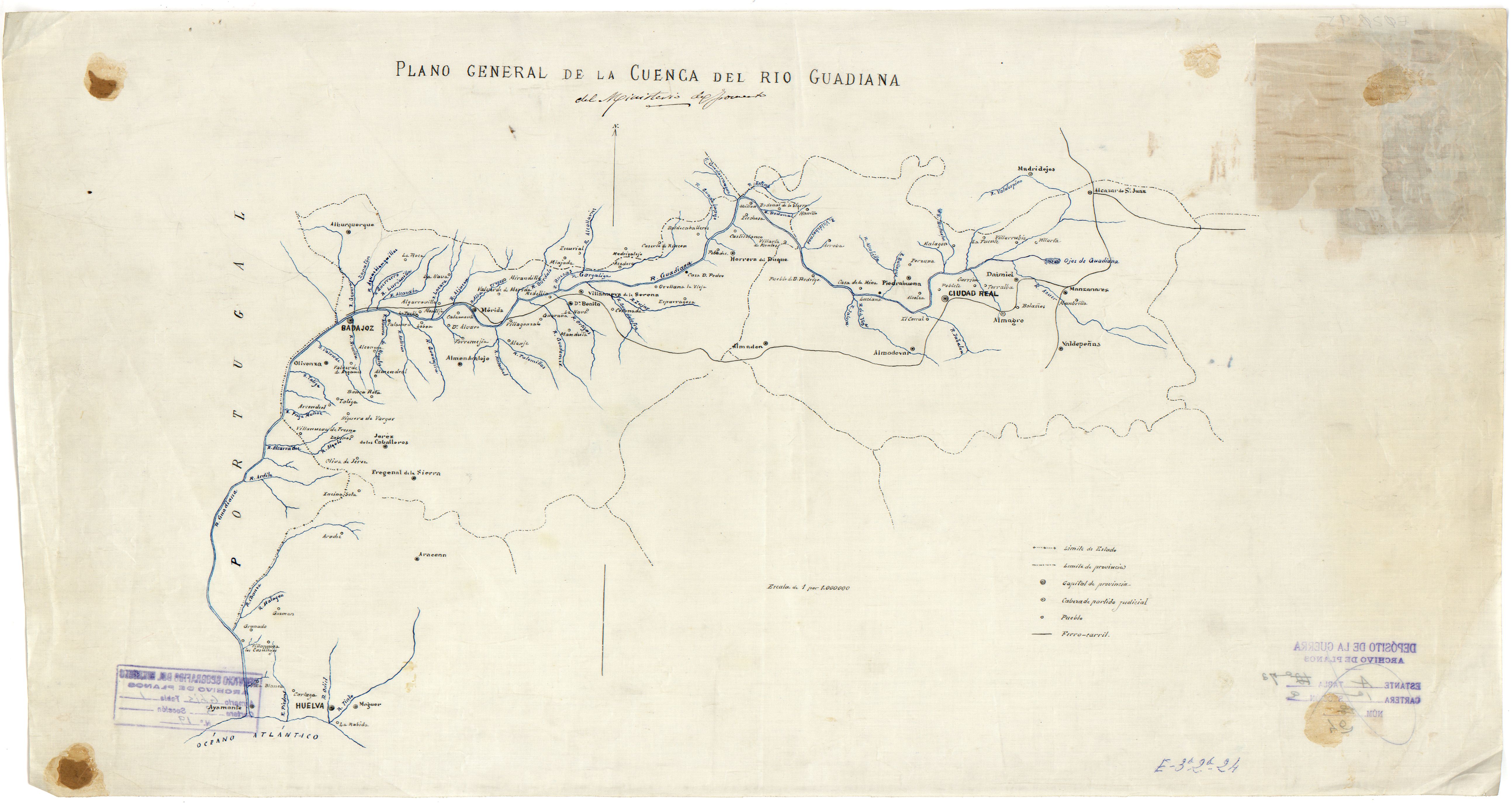 NOTAS Representa la cuenca del Río Guadiana. – Manuscrito a plumilla en tinta negra y azul. – Orientado con flecha. – Manuscrito sobre tela para planos. – Tabla de signos convencionales para indicar divisiones administrativas, núcleos de población de distinta categoría y ferrocarril |