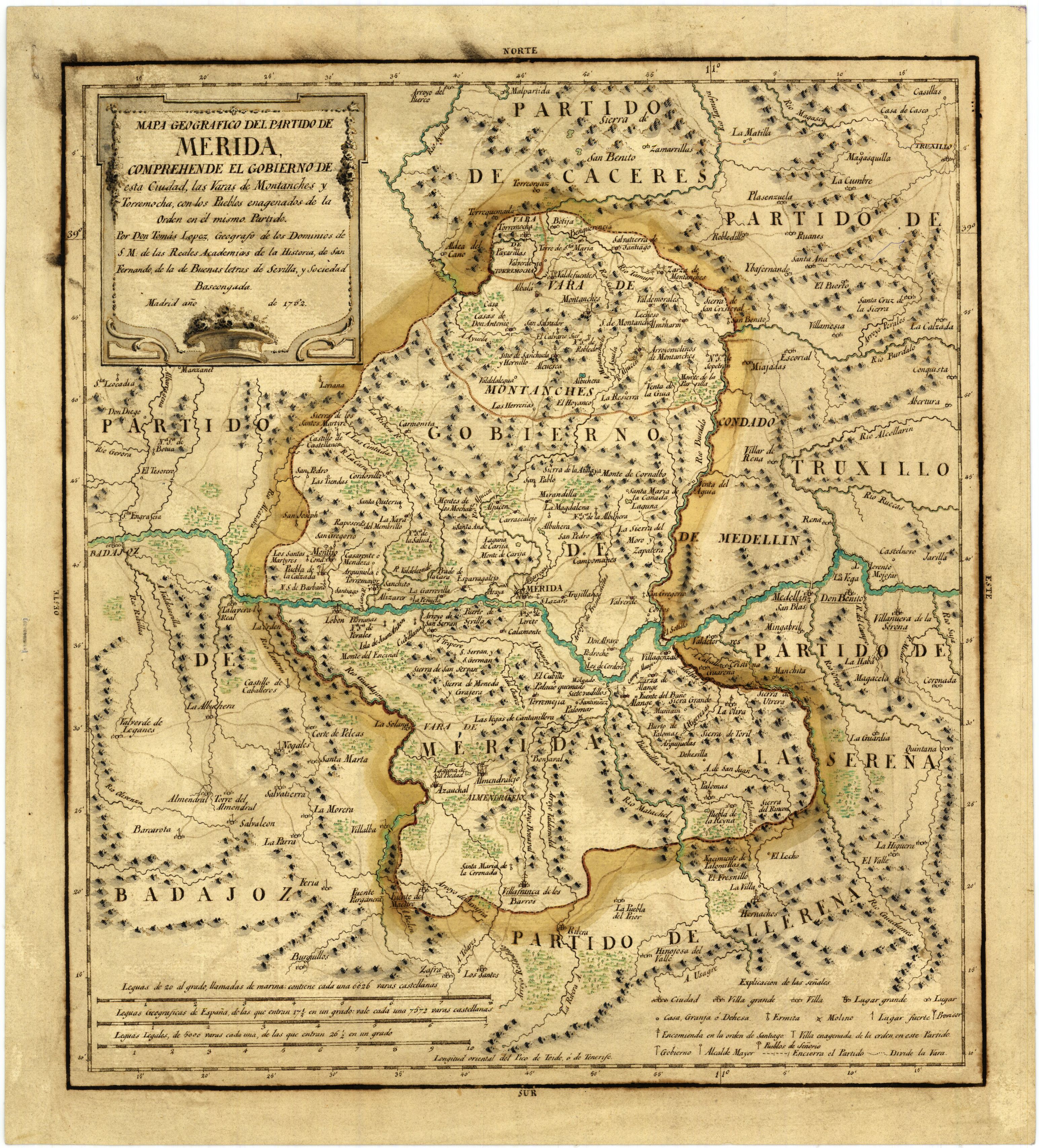 NOTAS Escalas gráficas de 7 leguas geográficas de España [= 14, 7 cm] y 10 leguas legales [= 14 cm]. – Coordenadas referidas al meridiano de Tenerife (O 10º11`-O 11º19`/N 39º9`-N 38º9`). – Relieve de perfil. – Figuran coloreadas a mano las divisiones administrativas en verde y amarillo. – Tabla de signos convencionales para indicar núcleos de población de distinta categoría, edificios civiles y religiosos y divisiones administrativas. – Indica vegetación y arbolado. – Título enmarcado en cartela barroca |