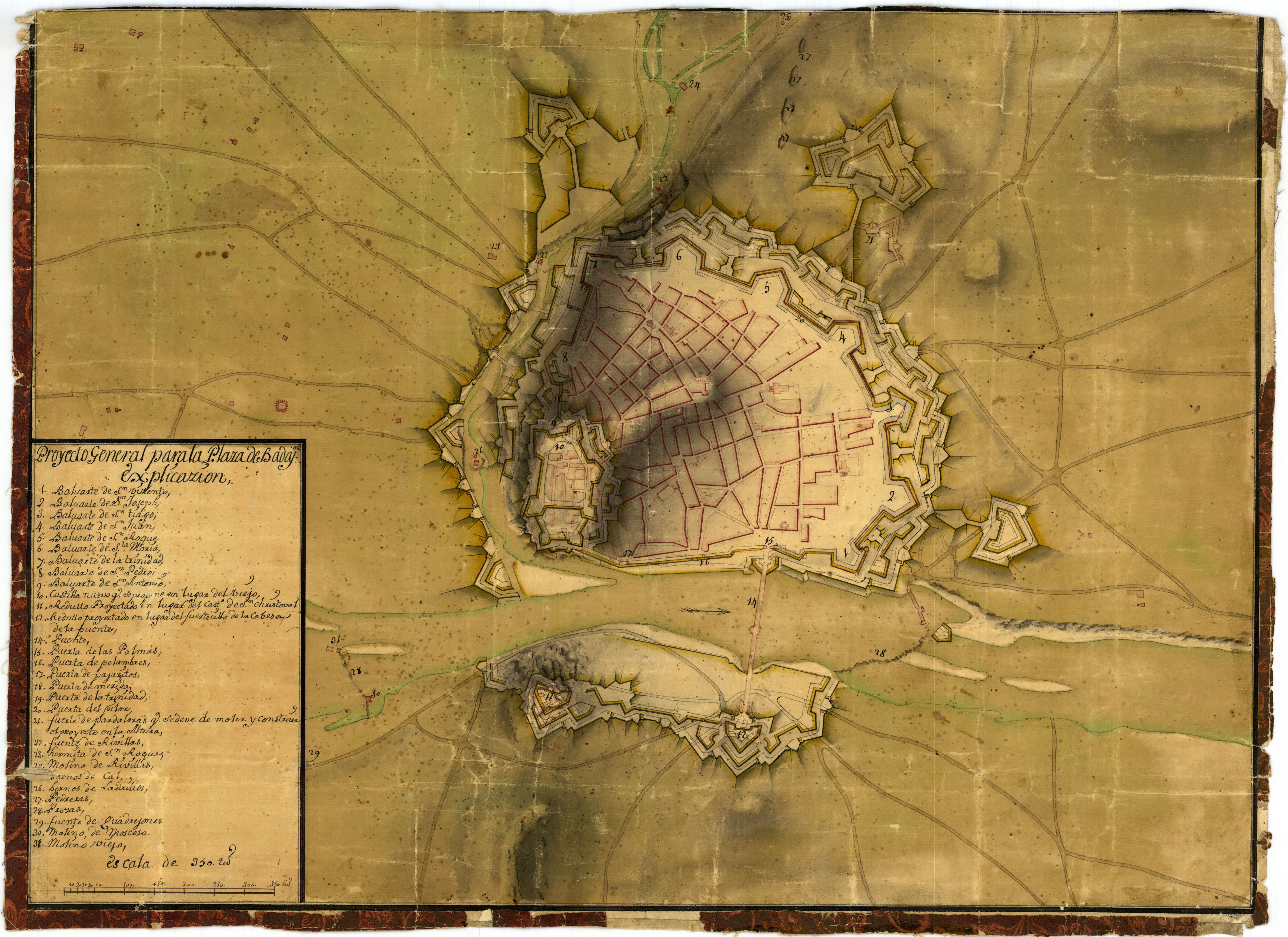 NOTAS Presenta el plano de las defensas de la plaza. – Mención de responsabilidad tomada del verso. – Relieve representado por sombreado. – Manuscrito a plumilla en tinta negra y coloreado a la acuarela en varios colores. – Relación de las baterías, puertas, fuertes etc de la plaza indicada mediante clave numérica. – Indica la dirección del río con flecha |