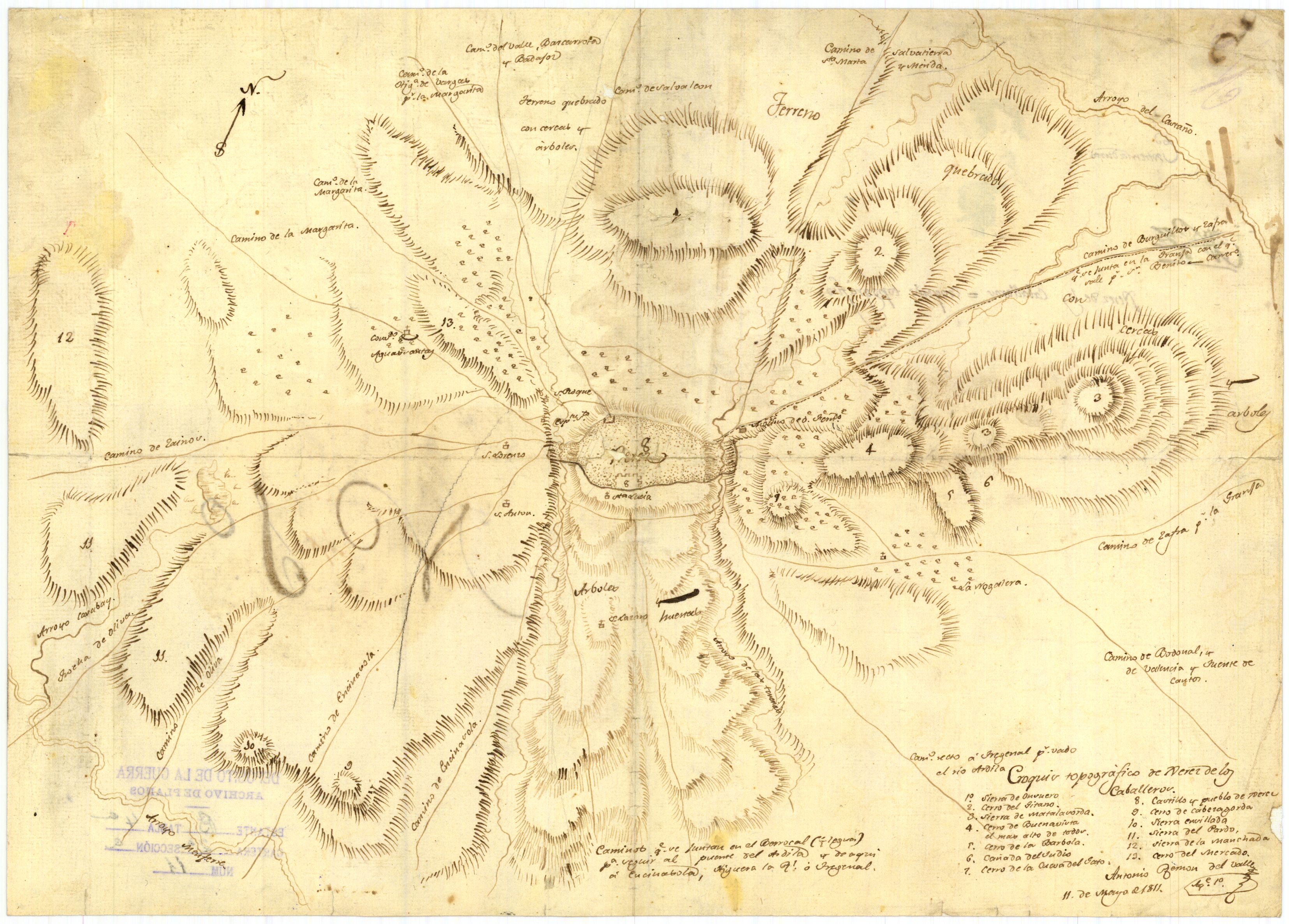 NOTAS Manuscrito firmado y rubricado por el autor. – Orientado con flecha. – Relieve representado por normales. – Relación de los principales accidentes geográficos junto al pueblo indicado mediante clave numérica. – Indica caminos |